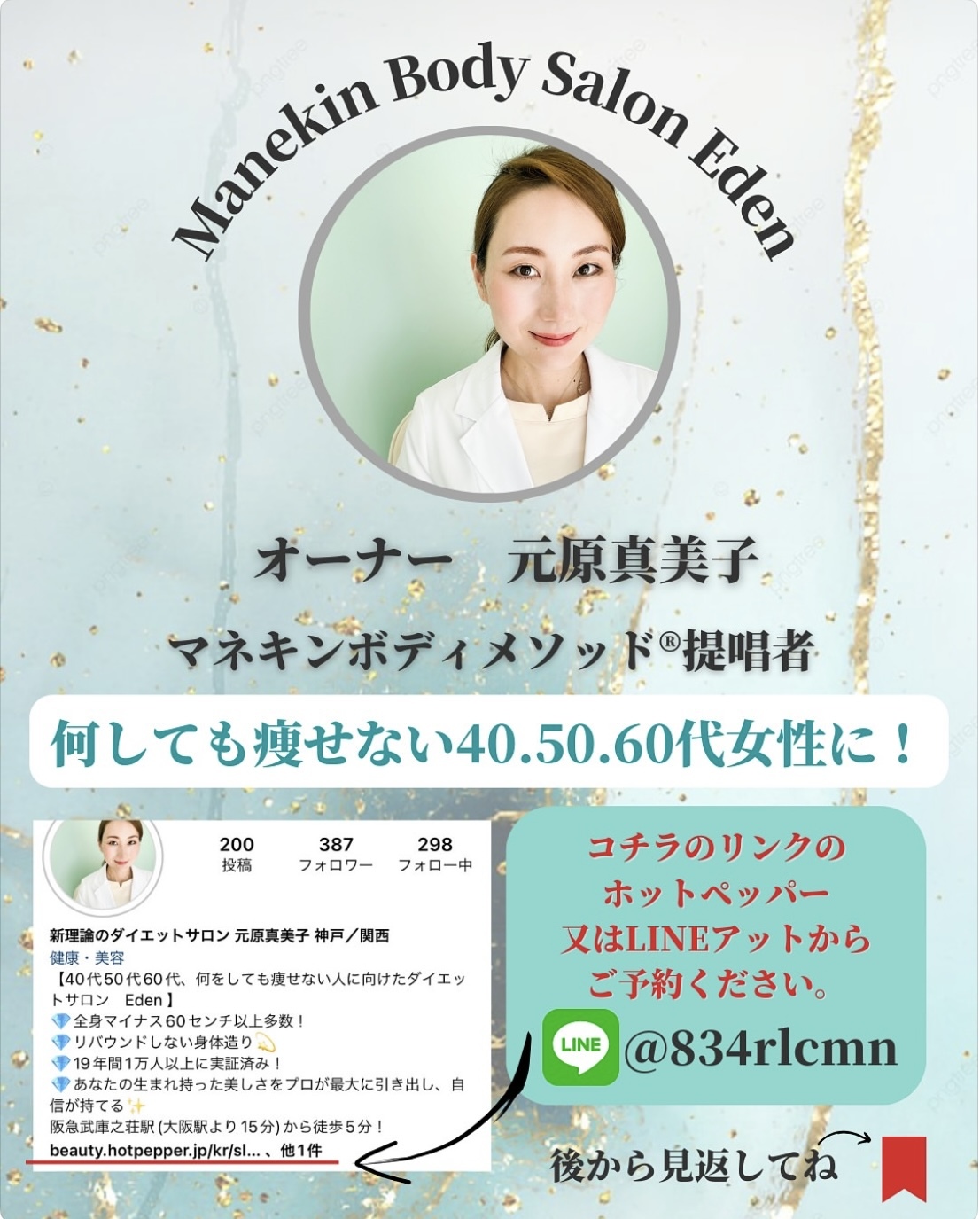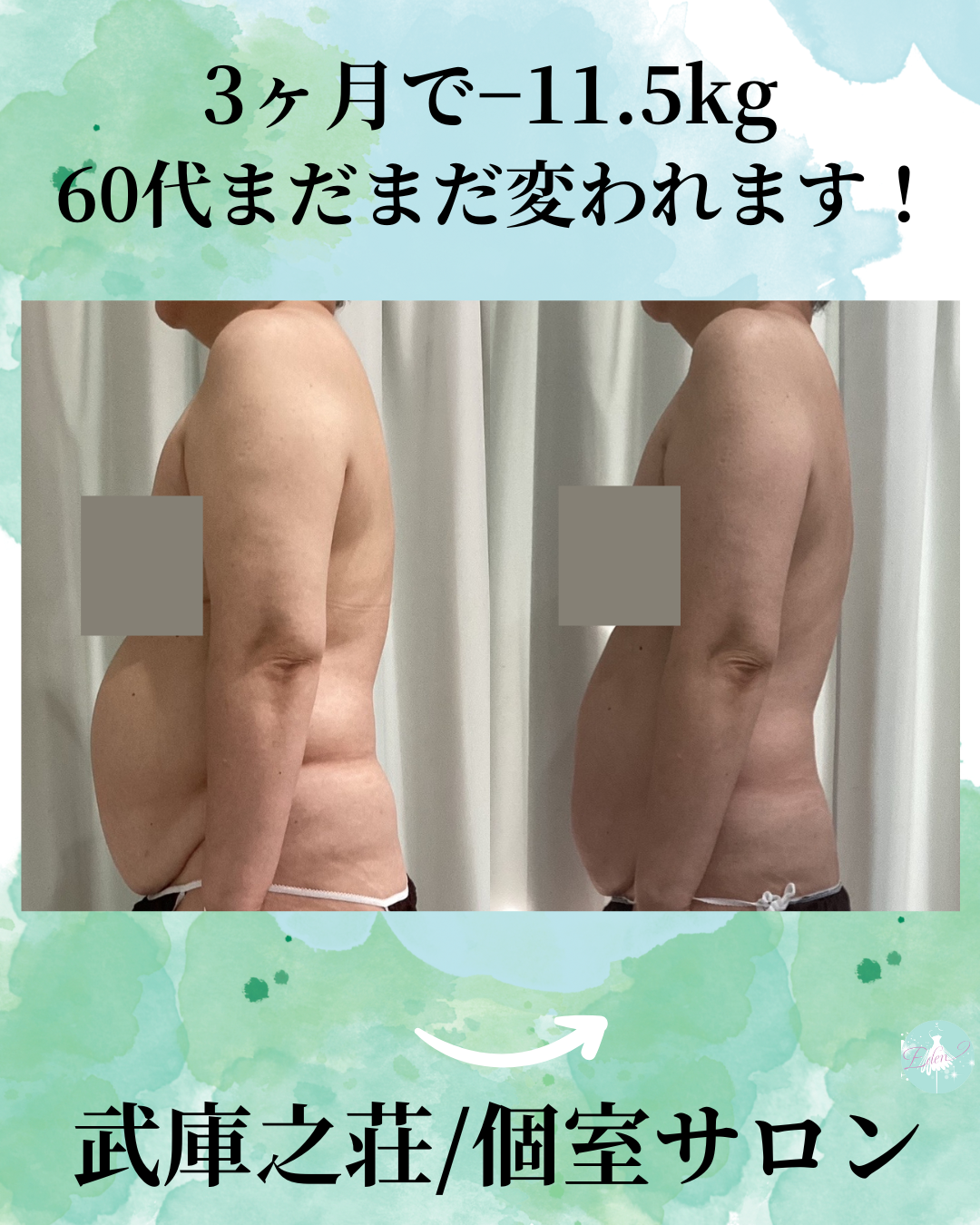 「何をやっても痩せないけれど、諦めたくない!今度こそ痩せたい!」という40・50・60代の女性をメインとしたお客様のお気持ちに応える完全プライベートサロンとして、短期間でリバウンドのないダイエットの結果を出すことを目標に、理想の体づくりをサポートしています。落ちにくい脂肪を落とすだけでなく、若い頃のような、メリハリのあるボディライン・「マネキンボディ」をつくるための独自の取り組みを行っています。食事制限なく・運動もなし、簡単な栄養管理で、ボディメイクや減量について研究を重ねて、1万人以上をサポートしてきた実績とこだわりのメソッドを活かし、尼崎市で美しいボディラインに導く専門の痩身サロンです。